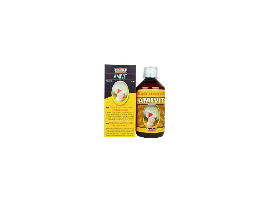 Vysoce účinná dotace aminokyselin a vitamínů AMIVIT obsahuje specifický komplex vitamínů, aminokyselin a dalších látek zohledňující individuální potřeby kategorie zvířat, pro kterou je určen. Všechny aktivní látky jsou ve formě, která zajistí maximální účinnost každé z nich tak, aby došlo k vyrovnání hladiny jednotlivých aminokyselin a vitamínů v organismu. Optimální hladina aminokyselin a vitamínů v organismu je mimo jiné zcela nezbytným předpokladem pro vysokou obranyschopnost a odolnost organismu např. proti infekčním a virovým chorobám. U užitkových zvířat jsou také eliminovány negativní důsledky poklesu užitkovosti z důvodu snížené hladiny vitamínů v organismu. AMIVIT se používá zejména v situacích jako je stresový stav, při zdravotních problémech a jejich prevenci, při nebezpečí infekce, při nedostatku vitamínů nebo aminokyselin v zimě, nesprávné výživě apod. Přípravek podporuje rychlou regeneraci organismu po onemocněních, doporučuje se také podávat v období březosti a mláďatům v době růstu. Vysoká účinnost AMIVITu je dána speciální technologií výroby, kdy jsou aktivní látky obdukcí chráněny před degradací v žaludku a zažívacím traktu. Tento ochranný obal je postupně odbouráván až dojde k úplnému uvolnění aktivní látky v organismu v její maximální účinnosti. Významným přínosem této technologie je skutečnost, že je v roztoku vytvořena speciální nosná a izolační houbovitá mikrostruktura, která zamezuje ulpívání vitamínů na stěnách rozvodu napájecí vody a v napáječkách. Tím se eliminuje hrozba namnožení nežádoucích organismů na těchto zbytcích a jejich následné roznášení v celém rozvodu napájecí vody všem zvířatům, jak je to časté při použití standardní tekuté olejové formy vitamínů. Složení: vitamíny aminokyseliny přírodní látky upravená pitná voda Krmný návod: Podává se v množství 10 ml na 1 litr napájecí vody po celý rok. Přípravek lze kombinovat a současně podávat s jakýmkoliv výrobkem značky BENEFEED® pro konkrétní kategorii zvířat. Seznam těchto výrobků najdete níže na této stránce, je zde však uvedeno pouze jedno balení každého výrobku. Další balení najdete v příslušné kategorii produktů. Skladování: Skladovat v suchém a temném prostředí v původních uzavřených obalech. Po otevření postupně spotřebujte, výrobek již dlohodobě neskladujte. Mikroskopické pevné částečky a mírný sediment je dán obsahem přírodních látek a není na závadu výrobku.Doplňkové parametry