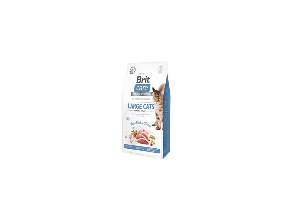BRIT CARE CAT GRAIN-FREE LARGE CATS POWER & VITALITY. HYPOALERGENNÍ RECEPTURA "ČERSTVÁ KACHNA & KUŘE".Kompletní krmivo pro velká plemena dospělých koček.
